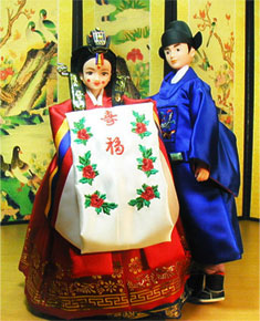 Koreans think marriage is the most important passage in one's life and a divorce is regarded as a disgrace not only for the couple but also for their families - even though the divorce rate is growing rapidly these days. Today's typical wedding ceremony is somewhat different from what it was in old times: first a Western-style ceremony is usually held at a wedding hall or a church with the bride wearing a wedding gown and the groom a tuxedo, then later in the day the bride and groom have a traditional ceremony at a different room in the venue, in colourful traditional customs. |